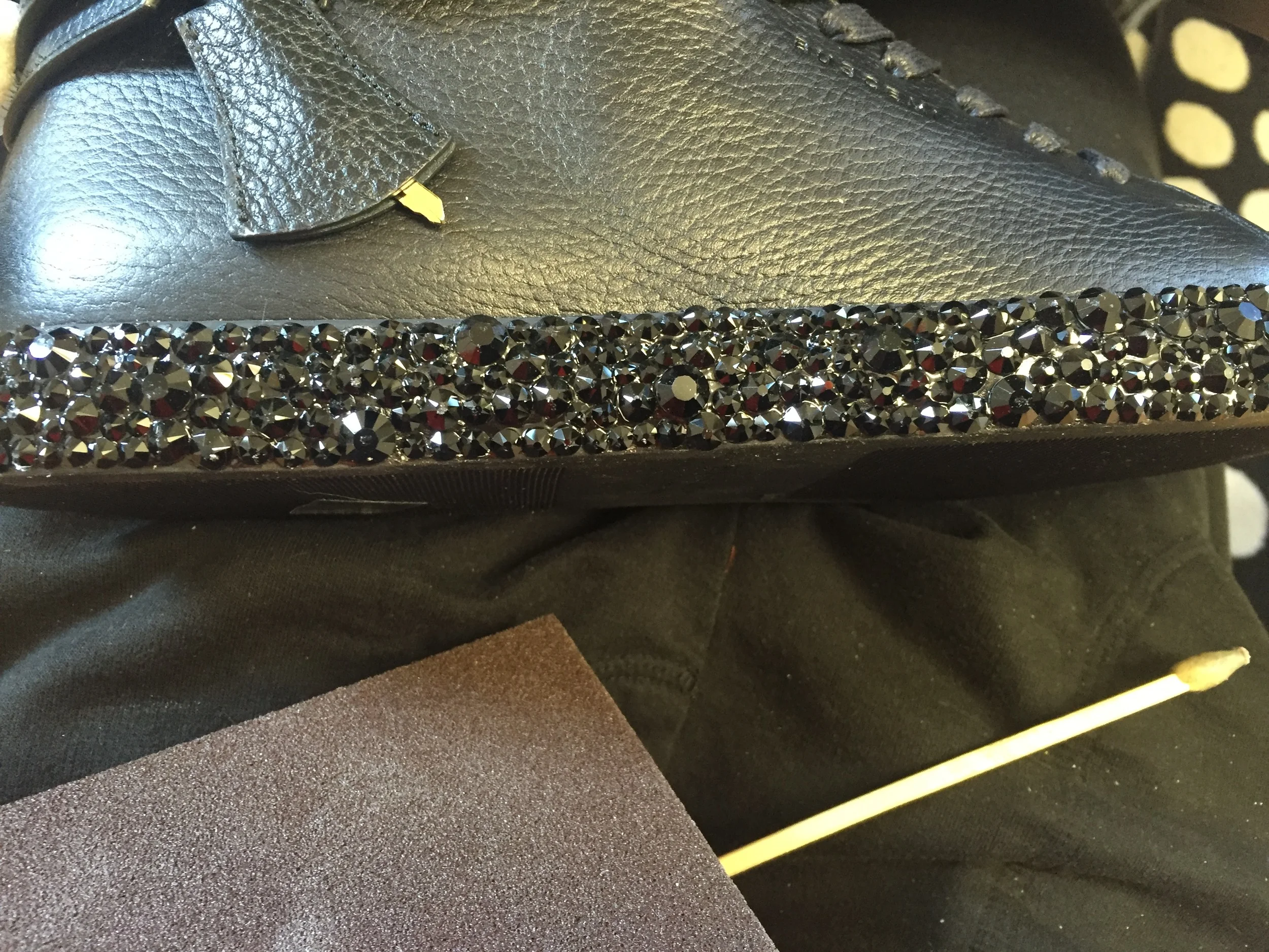 A-Morir studios worked with stylist Misa Hylton to embellsih Alec Baldwin's suit for his ongoing Amazon Echo commercial series. The suit was hand embellished with 14,000 Swarovski crystals in 4 sizes. Embellishments included the crystal AB circle logo on the back jacket, 3'' wide crystal tuxedo stripes on each pant leg, star detail n the arim, and black crystals on both sleeves lapels, and gum sole of his shoes.