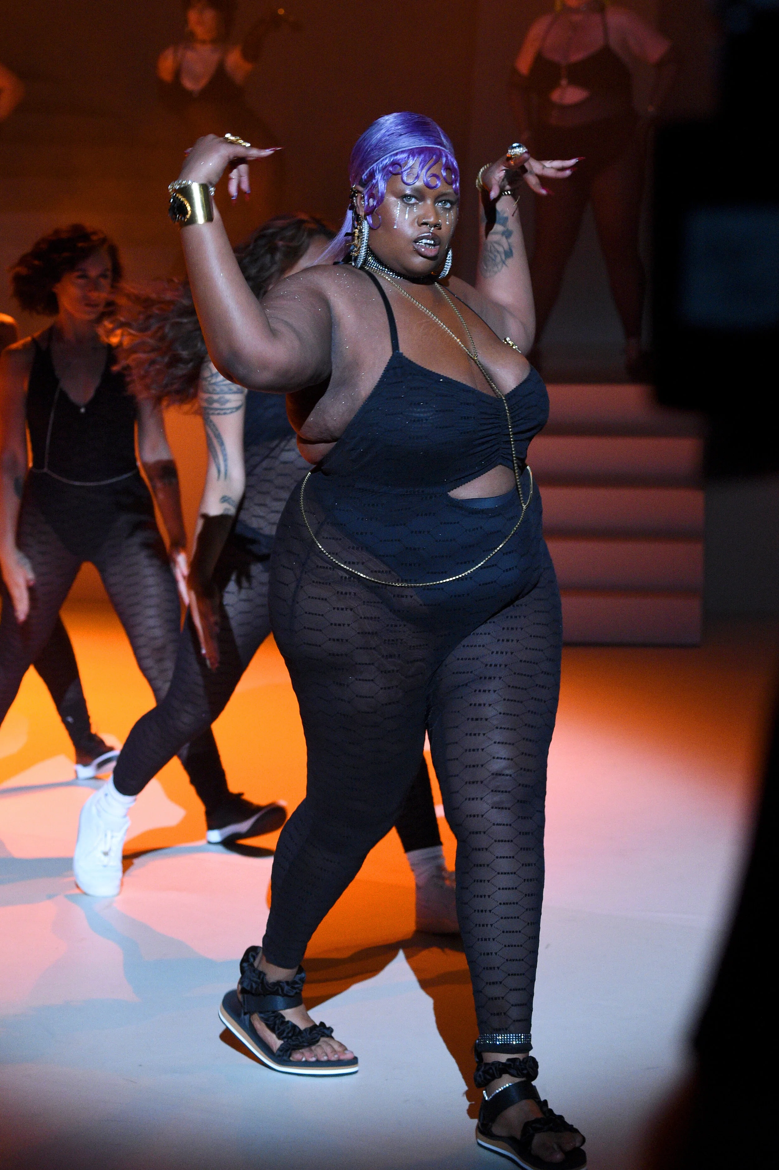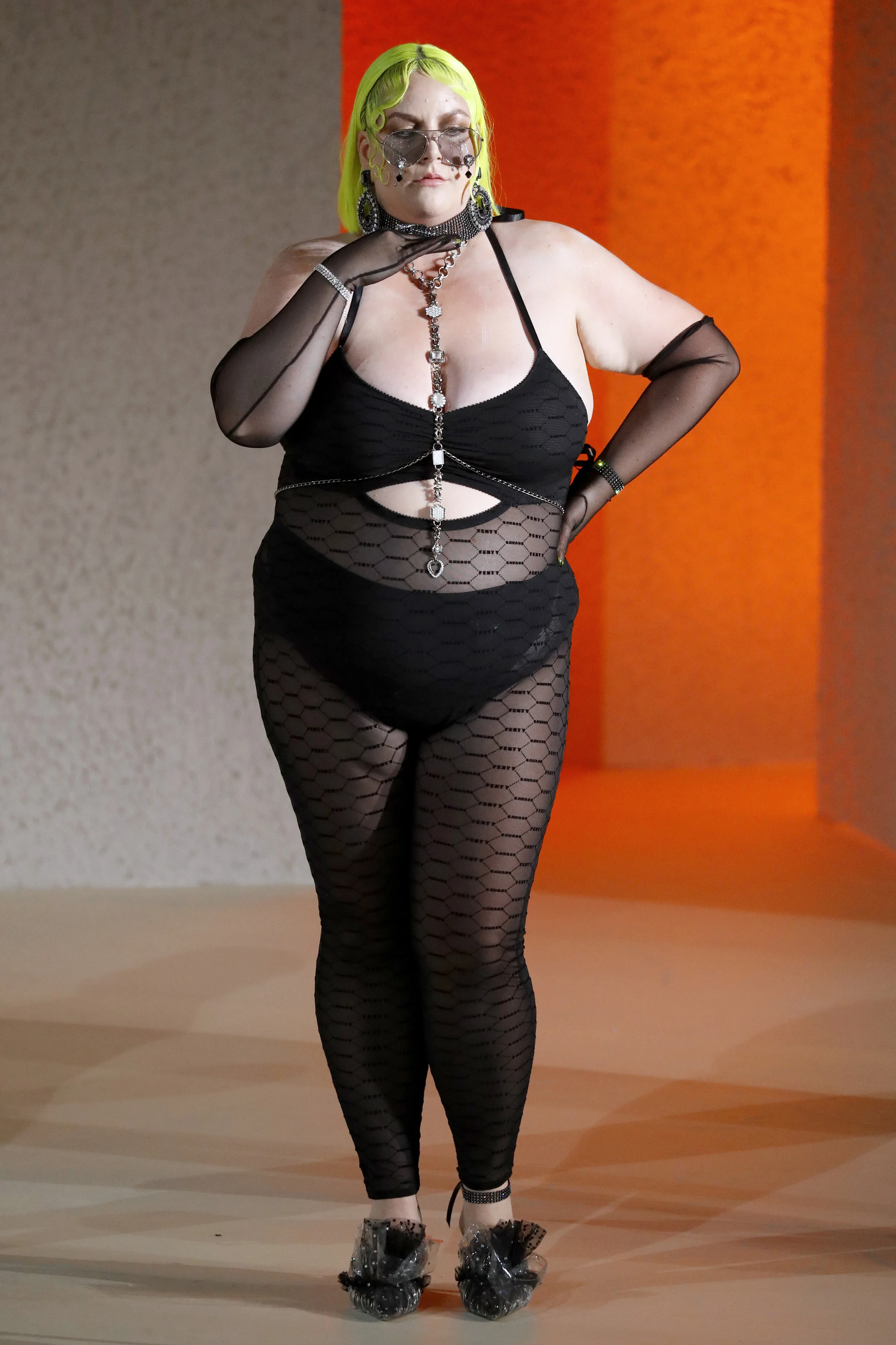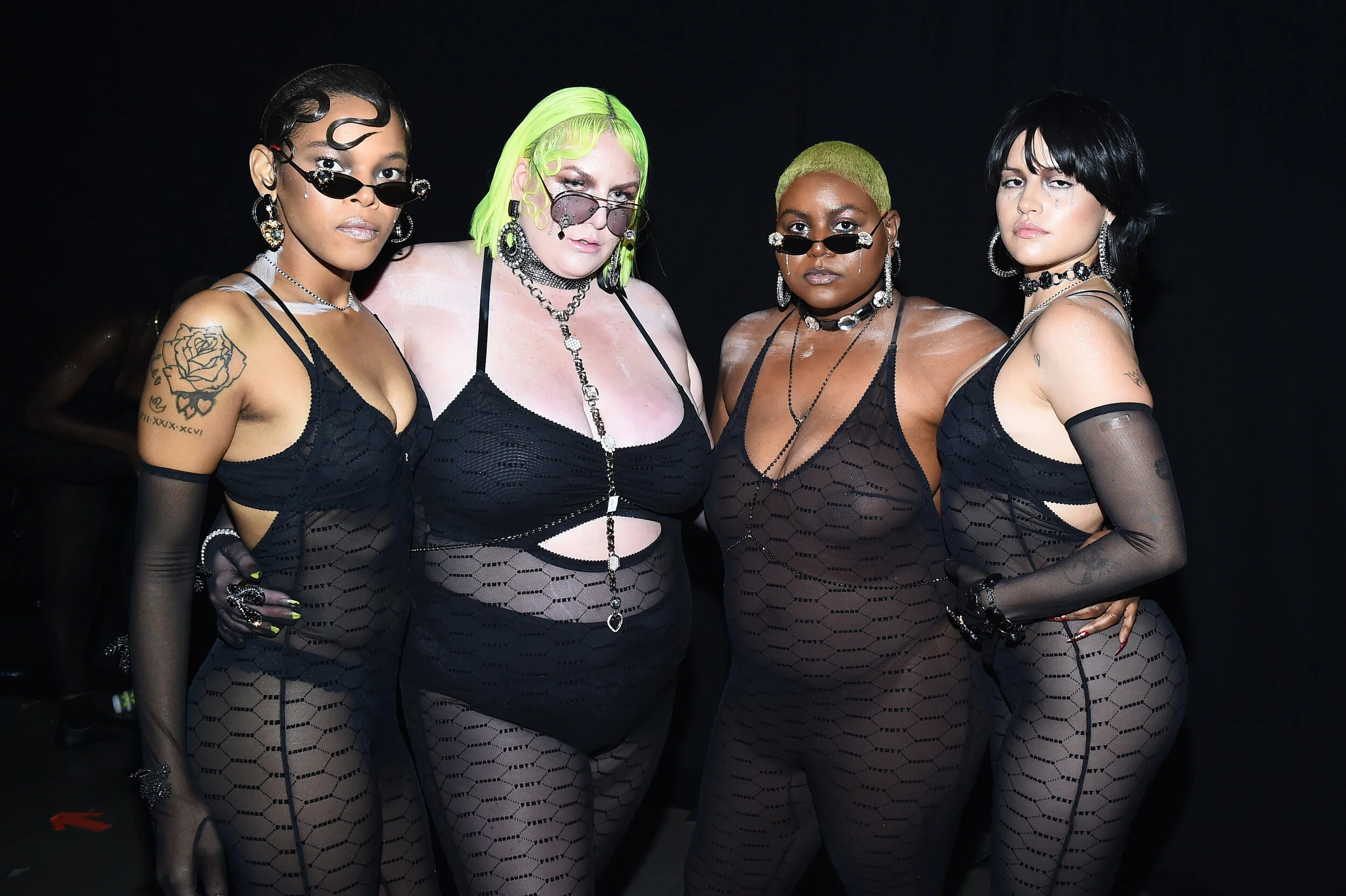 a-morir was hired to be the crystal artist in residence for the Savage X Fenty 2019 runway show. Creating over 200 custom pieces used as styling inspiration and for the runway including sunglasses, earrings, made to measure body chains, chockers, necklaces, anklets and bracelets. Custom embellished pieces included Cara Delevigne’s heart whip, Laverne Cox’s shoes, and custom crystal teardrops were added to Cara’s gloves. Scroll down for runway images and video and click to enlarge.