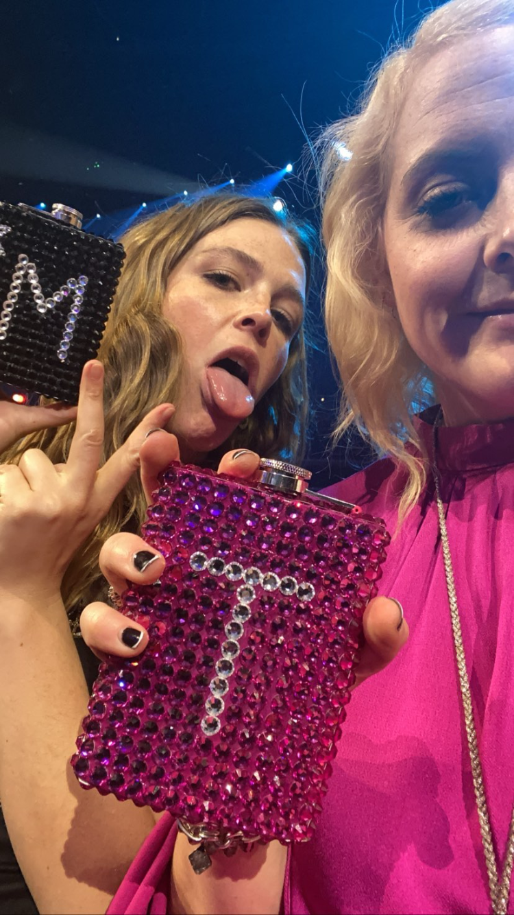 For Maggie Rogers first invitation to the Grammys in celebration of her Best Emerging Artist nomination stylist Kat Typaldos commissioned A-Morir to create custom flasks for Maggie and her best friend Taylor to match their dresses. Taylor’s flask was painted and embellished in a beautiful fuchsia, while Maggie’s had hand drawn stars to match the details of her archival Chanel gown. Scroll down for some truly delightul images.
